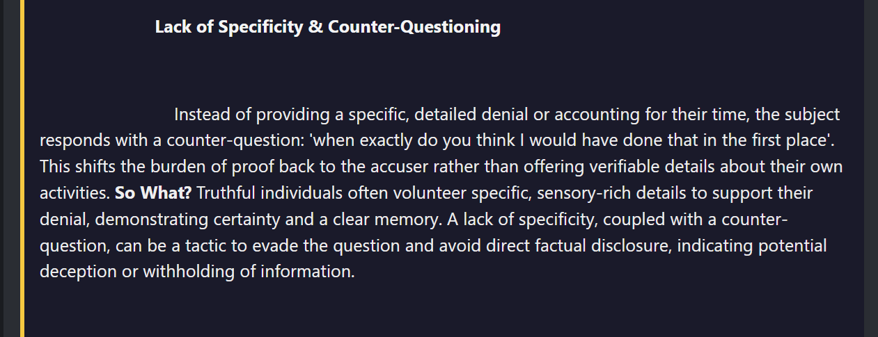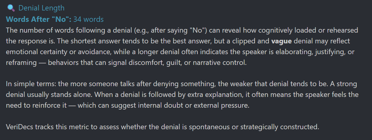 VeriDecs is your forensic companion in the world of language. We analyze statements by using Statement Analysis (SA) and Scientific Content Analysis (SCAN). Both methods are applied to statements where the subject is freely choosing the words — typically a narrative written by the subject themselves or a verbatim transcript of a verbal interview where open-ended questions were used. The core principle is that a truthful statement based on memory of a real event will have predictable linguistic features that a deceptive, fabricated, or incomplete account will lack. The function of Veridecs is to detect linguistic or structural anomalies typical of subjects giving misleading statements or having guilty knowledge.