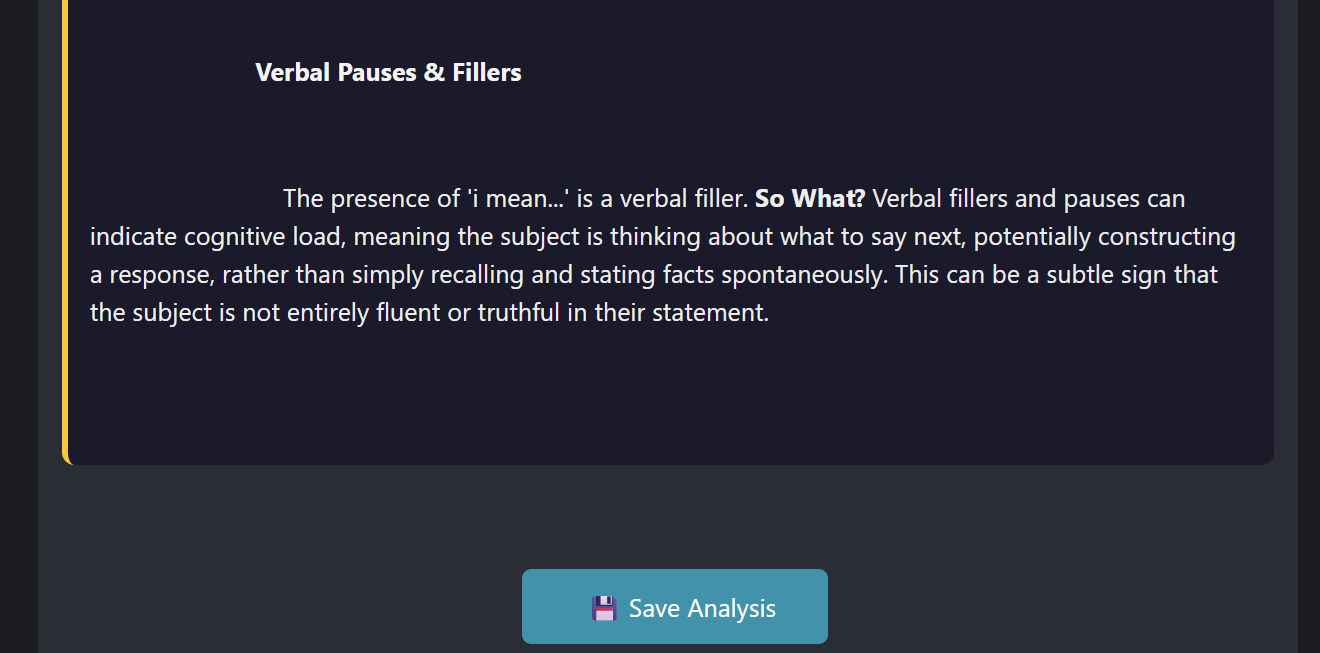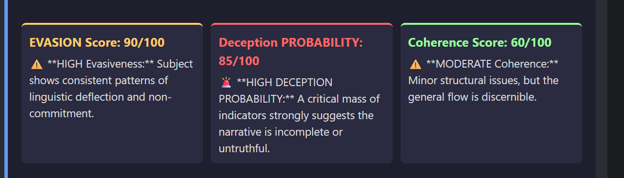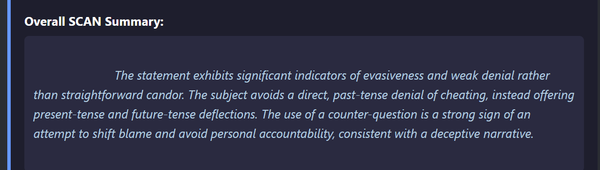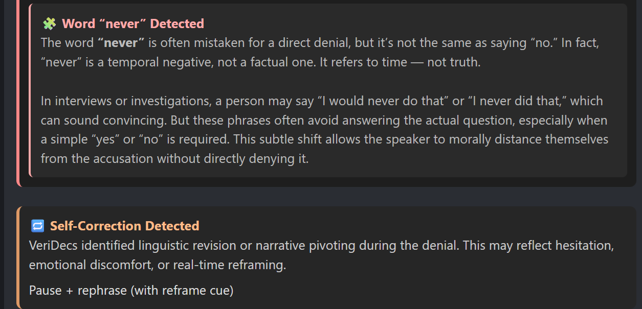 Go beyond surface-level cues with AI-powered analysis that reveals the emotional and structural fingerprint of a statement.